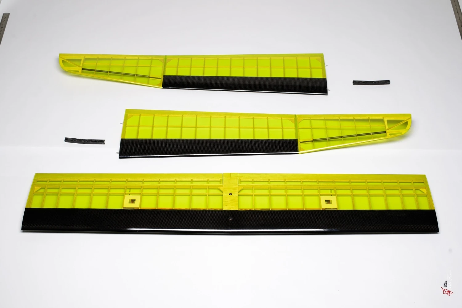 The tailplane is a feather weight built-up balsa and carbon construction, covered with lightweight transparent film and is supplied ready to bolt onto the rear pylon mount. The tailplane is of improved construction and includes a separate ready hinged elevator for faster pitch response.