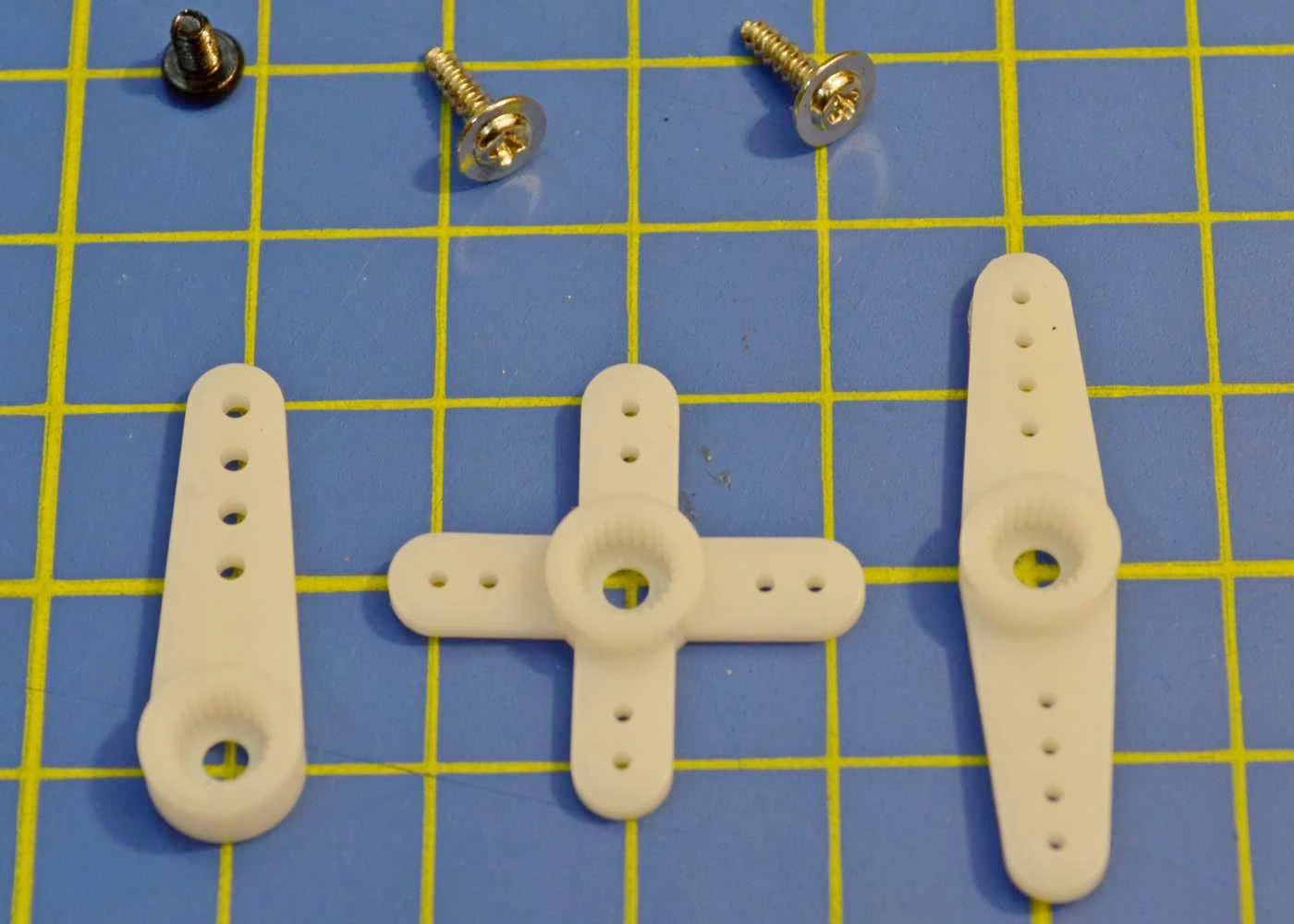 Contains three nylon output arms, one output arm retaining screw, and two servo mounting screws.